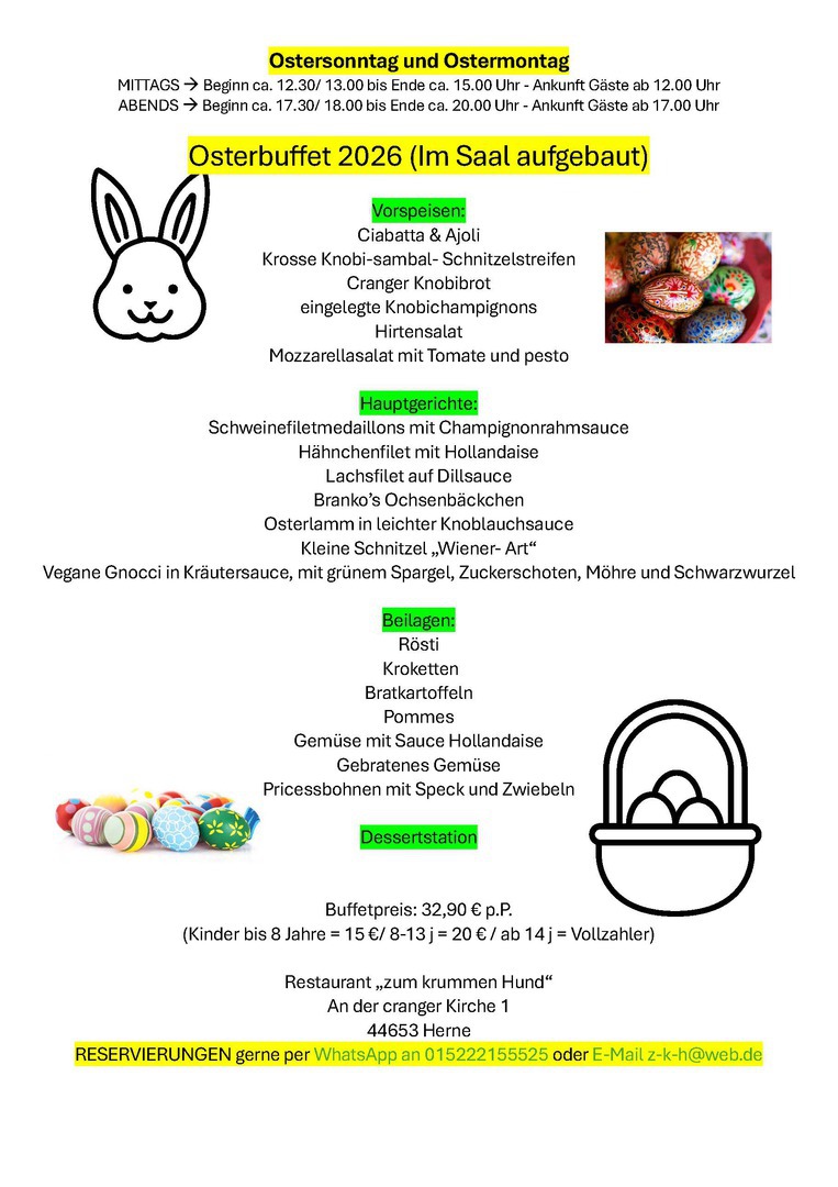 Liebe Gäste, auch in diesem Jahr bieten wir ein „zum mitnehmen“ an beiden Ostertagen an. Schickt uns gerne eure Bestellungen schriftlich (bitte nicht telefonisch oder persönlich – mündlich) und wir sprechen die Zeiten dann individuell ab, je nachdem was noch frei ist. Liebe Grüße „ Zum Krummen Hund